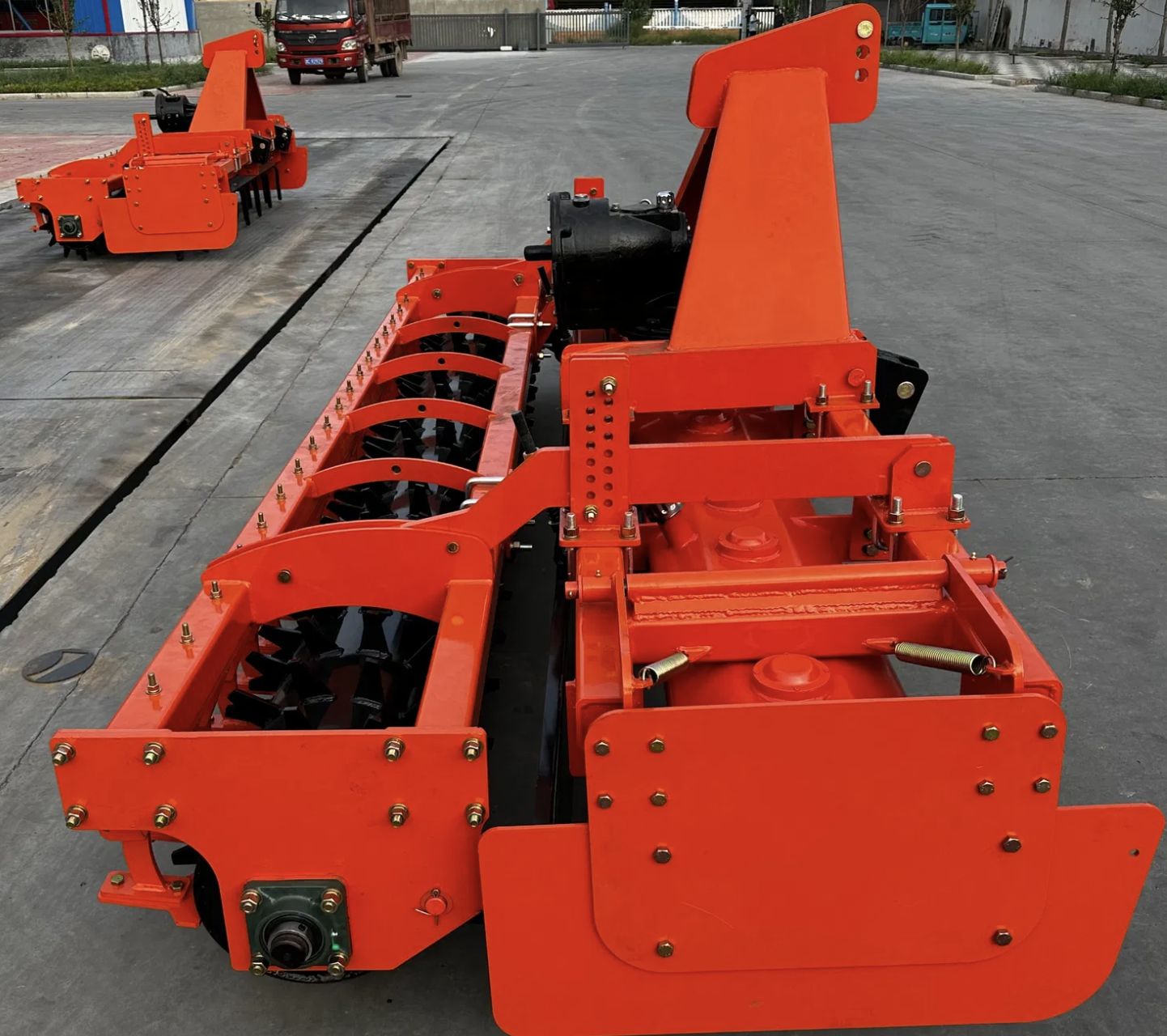 The power harrow utilizes the opposite rotation of two adjacent tines to crush the soil. The working depth can be controlled and can reach 10-30 centimeters, allowing for soil fragmentation, leveling, and compaction to be completed in one pass. After the work is completed, the surface of the ground is relatively smooth, forming a good seedbed. This seedbed has the advantages of high uniformity, good consistency in working depth, suitable soil porosity, and strong water retention capacity. When using the power harrow on land with straw returning, the straw can be further buried in the soil, while a rotary tiller may bring buried straw back to the surface. Long-term use of a rotary tiller for land preparation can lead to soil compaction, while the power harrow, as it does not turn over the soil, can maintain soil moisture. On leveled land, the emergence rate of crops with the power harrow is significantly higher than with a regular rotary tiller. It is suitable for small-scale cultivation and is convenient for tractor operation.